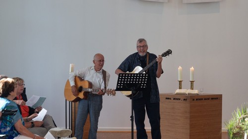 Für eine besondere Freunde sorgte die Anwesenheit die früheren Pfarrer Lothar Kuschnik, Volkert Bahrenberg und Volker Kramer. Nach dem Gottesdienst holten Kuschnik und Bahrenberg ihre Gitarren hervor und stimmten Lieder von früher und von heute an. In einer von Kirchmeister Christopher Wittmers moderierten Talkrunde berichteten beiden Theologen vom Aufbruch, der die Gemeinde im Fuhlenbrock in den 1980er Jahren bewegte. Einer der Höhepunkte war damals der Besuch von WDR-Reporterin Carmen Thomas mit dem „Hallo Ü-Wagen“. Die Besetzung der vier Stühle in der Talk-Runde wechselte, so dass alte und junge Stimmen zu hören waren.
