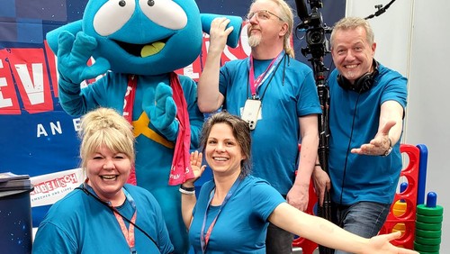Der zweite Tag begann wie der erste. Der große Besucherandrang setzte sich nahtlos fort und Saskia Treffer und Jörg Eilts hatten wieder viel Gelegenheit unsere digitalen Projekte wie den Podcast Wortschritte oder das Erklärfilm-Format Kunterbuntes Dingsda für Kinder ab 5 Jahre vorzustellen. Unterstützung kam von der Kollegin Jennifer Cetera, die gemeinsam mit Kameramann Michael Bokelmann für einen Tag zum Kirchentag anreiste. Während die beiden Mitarbeiterinnen sich fortan um den Stand kümmerten, nutzten Eilts und Bokelmann, unsere eingespielte Filmcrew, die Gelegenheit, mit Logodor reichlich Material für eine neue Folge Logodor on Tour zu drehen. Ein echtes Highlight: die Begegnung mit Anna-Nicole Heinrich, Präses der Synode der EKD. Die junge Kirchenfunktionärin war sehr angetan vom Kunterbunten Dingsda und adelte es mit der jugendsprachlichen Bemerkung: „Das ist nicht cringe.“ Ein Selfie mit Logodor durfte auch nicht fehlen.