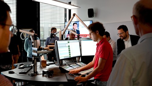 Nach einer kurzen Einführung ging es dann um kurz vor zehn Uhr ins Studio. Morgenmoderatorin Vanessa Winkel ist gerade dabei, die Sendung an Andreas Wiese zu übergeben. Er moderiert die neue Vormittagssendung, die für die ganze Region gesendet wird. Wiese erklärt, wie moderne Technik dafür sorgt, dass Wetter und Verkehrsmeldungen genau auf die jeweiligen Verbreitungsgebiete abgestimmt werden. Und dann schaltet er das Mikrofon ein, die rote Lampe im Studio geht an, und 20 Pfarrerinnen und Pfarrer schauen staunend zu, wie der Moderator die Ansagen macht, vier Bildschirme im Überblick behält und das Mischpult bedient. Die technische Ausstattung des Sender ist nicht mit umgezogen – im neuen Funkhaus sind auch alle Geräte neu. Chefredakteur Hemme erzählt, dass die Innenarchitekten leider nicht mit der Abwärme der vielen Geräte gerechnet haben. Deshalb müsse in den kommenden Monaten noch eine Klimaanlage für die Studios installiert werden.