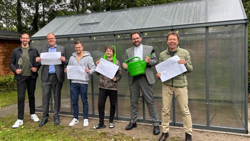 Von der gelungenen Fertigstellung des Gewächshauses haben sich in dieser Woche überzeugt (von links): Tim-Ole Fischer (Einrichtungsleiter des Dorothea-Buck-Hauses), Jan Schäfer (Vorstandsmitglied der Sparkasse Bottrop), Max Hausmann (Wohngruppen-Mitarbeiter), Bewohnerin Samy, Steffen Riesenberg (Superintendent des Evangelischen Kirchenkreises Gladbeck-Bottrop-Dorsten) und der theologische Geschäftsführer des Diakonischen Werks, Karl Hesse.